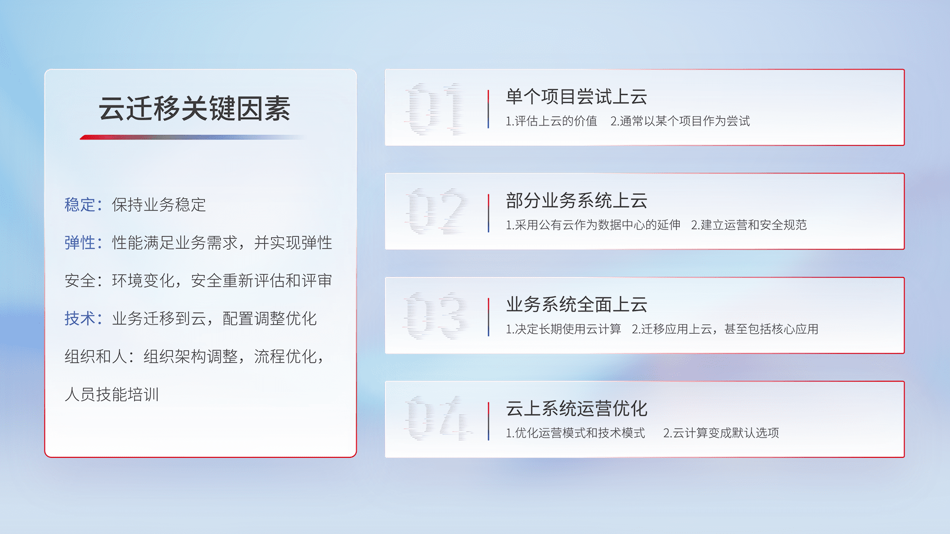 结合实际业务,,,从规划设计、、云平台选型、、、、云原生改造、、数据迁移、、集成交付,,,迁移全过程为客户识别最佳上云路径,,,做好风险识别管理,,,设计网络架构、、身份权限、、、安全审计合规、、操作审计、、日志审计、、、监控告警策略、、、、多站点容灾设计等,,,对云上基础设施进行整体规划,,提升IT治理水平,,,以满足弹性、、、、高可用、、高性能的需求。。。。