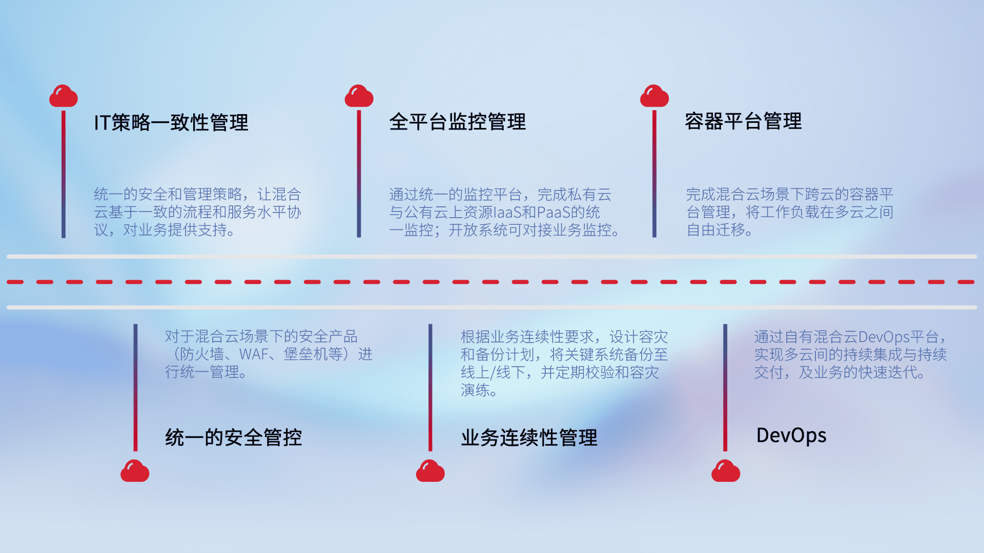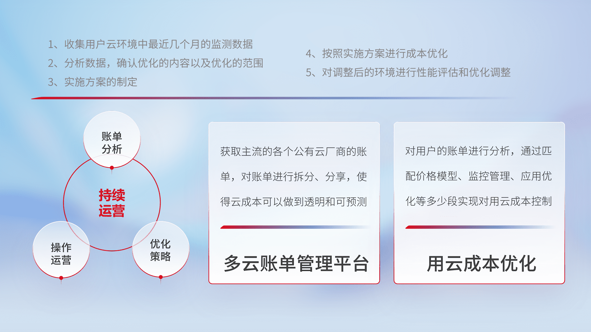 通过多云纳管,,以统一的资源数据模型把客户的云资源进行抽象和封装,,进而实现对多云资源的统一操作,,,保障云资源管理的可靠性、、、稳定性与可用性。。。量身定制化运维内容,,,配置、、、、开发运维、、、补丁管理、、备份、、、监控、、认证和访问管理、、审计和日常巡检等,,,,保障在用云过程中的可靠度,,稳定度以及高可用率。。。